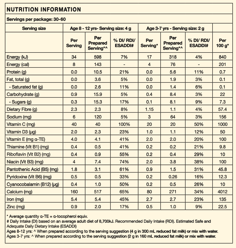 - 8-12years: add 4 scoops to 300mL of reduced fat milk (or any food or drink of choice). Use the scoop provided